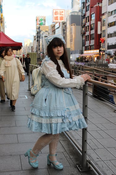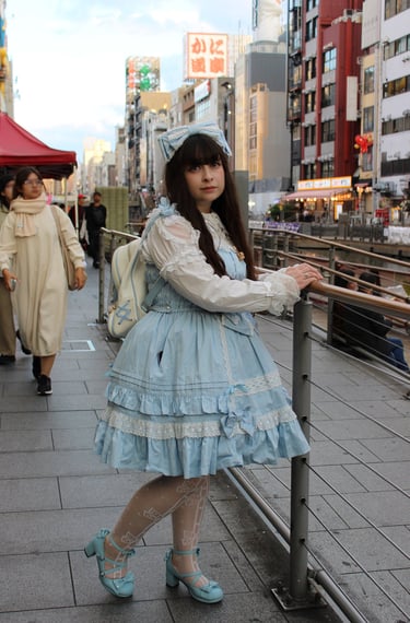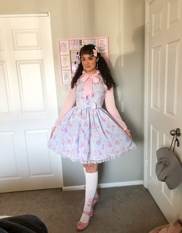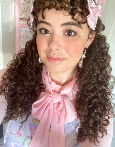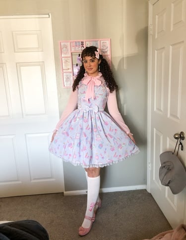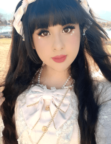 Lizbeth (she/her) is a graphic designer and artist for Rosé Forêt. She has been wearing lolita since 2013, focusing on sweet and hime with a love for collecting bunny and rose prints. She also loves incorporating her outside interests into the details in her coords, from Pokemon themed accessories to JoJo’s Bizarre Adventure pins to Sailor Moon and Princess Peach themed ita bags. She loves competing in fighting game tournaments (and losing) and straight up vibin’.