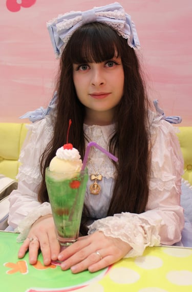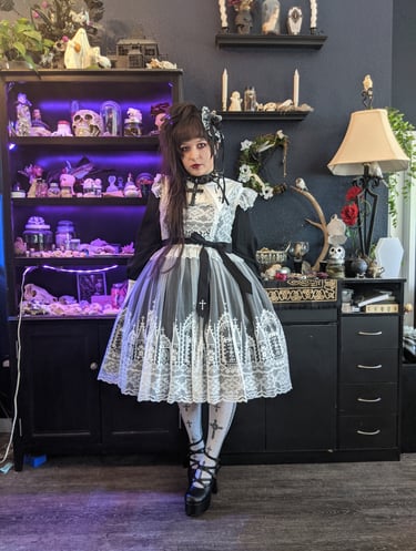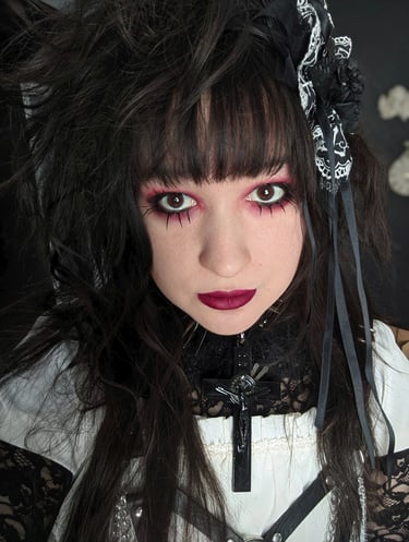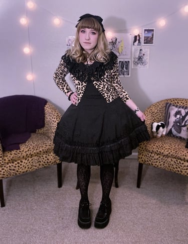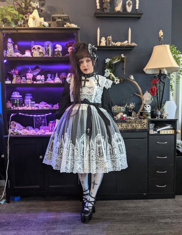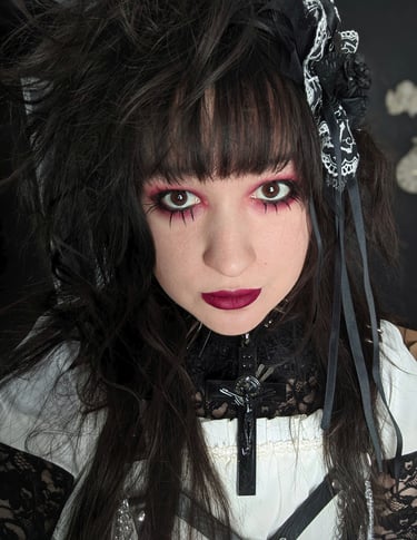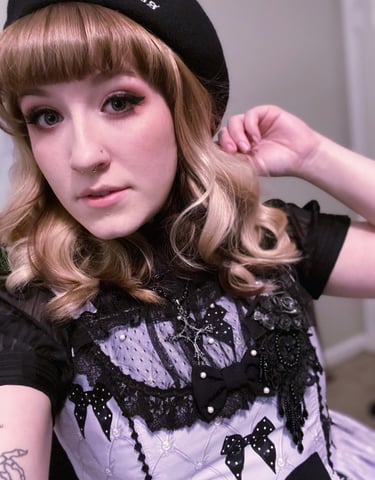 Nicole (she/her) is the Marketing Director for Rosé Forêt. She has been wearing lolita fashion since 2011 and cult party kei since 2014. She's dabbled in several different careers, including animation, graphic design, computer networking and support, and pet grooming and styling. Nicole is described as our resident grumpy goth, having only a dark and spooky aesthetic drawing inspiration from the goth subculture, horror, and the paranormal. Being very interested in biology, her hobbies outside of fashion include fish keeping, gardening, and animal preservation.