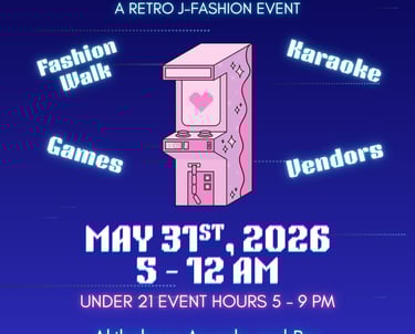 Enjoy authentic Japanese arcade games all night, and shop from vendors with a variety of y2k, anime and J-fashion inspired merchandise. Show off your coordinate in the fashion walk, and make sure to stick around for karaoke!