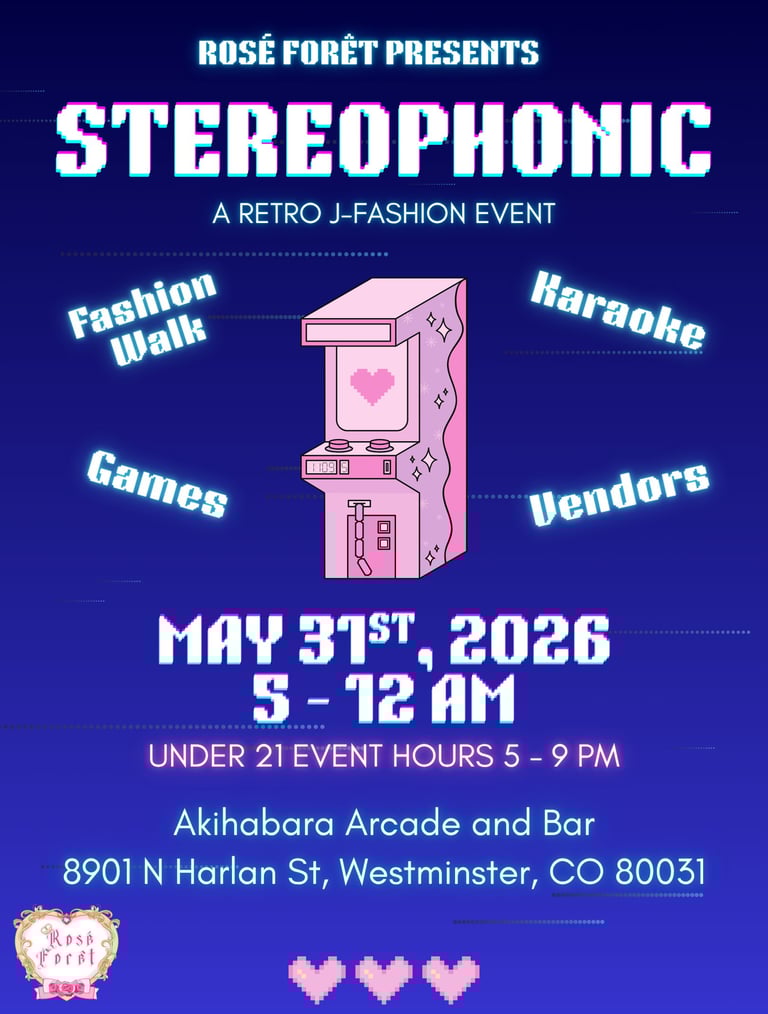 Rosé Forêt invites you join us on May 31st, 2026 for a retro inspired J-fashion and gaming night at Akihabara Arcade and Bar in Westminster, CO.